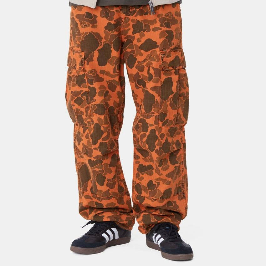 El Duck Cargo Pant, con un estampado integral de camuflaje, se ha confeccionado en tejido ripstop de algodón de peso medio, y se ha teñido en prenda para darle un aspecto más suave y una configuración de color compleja. El pantalón tiene un corte regular con talle bajo y presenta doble capa en las rodillas. Los múltiples bolsillos hacen un guiño a las influencias militares de la prenda, y la apertura regulable en la pierna ofrece un ajuste adaptable. Una etiqueta cuadrada tejida completa el diseño.